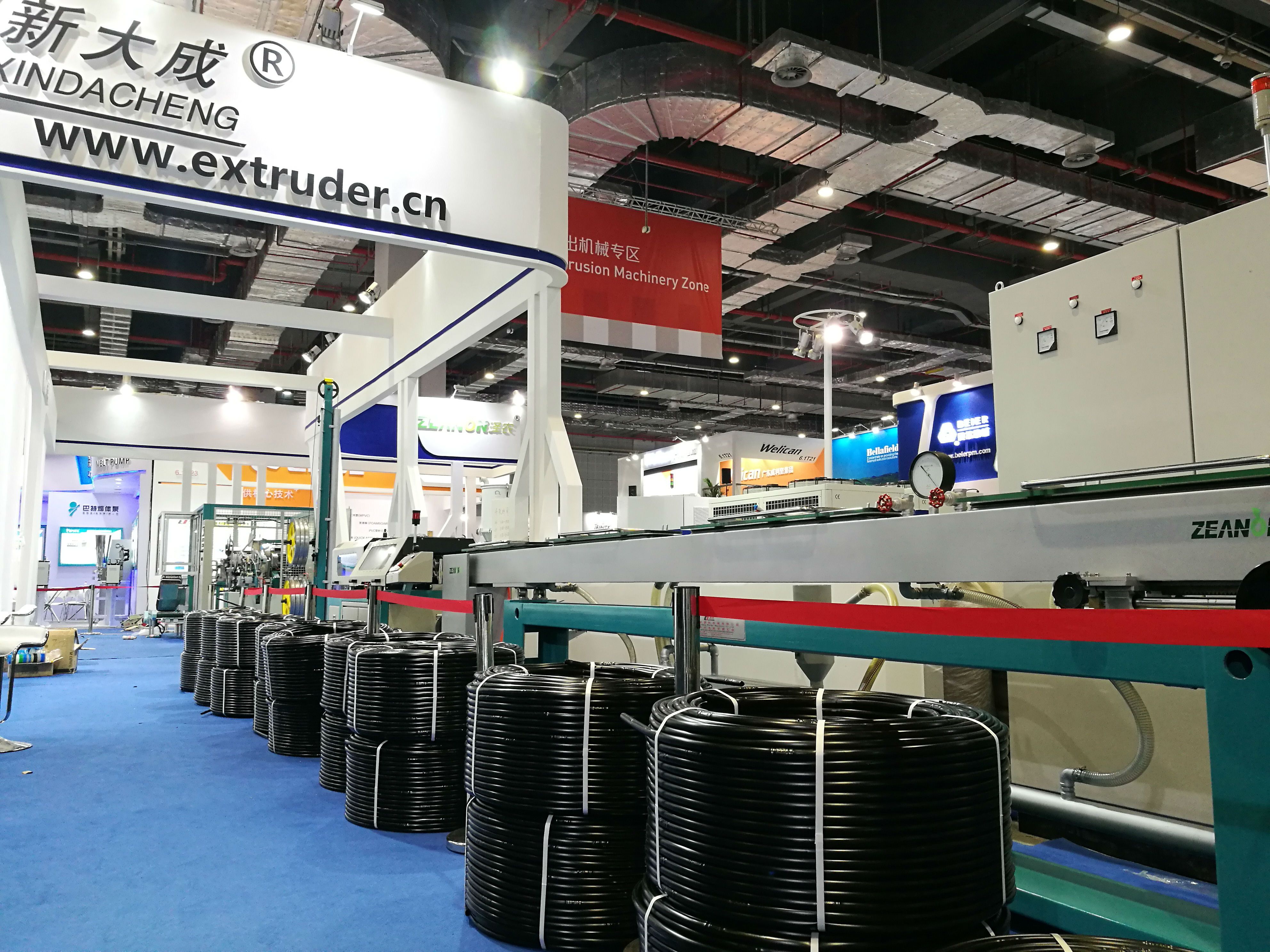 2. Complete High round drip irrigation Pipe Production line, running speed 100m/min, and demonstrate full aumatically pipe winder, online strapping packing system.