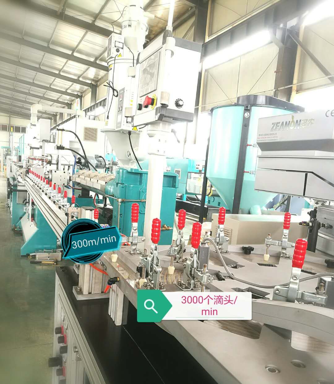 --Three punching machines, punching speed: 3000 times/min, to meet the production spacing of 10cm drip irrigation tape, speed:300 m / min. It is the fastest production efficiency of dripline products in the world.